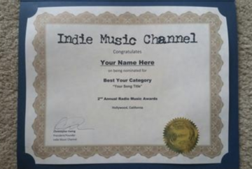 Our prestigious Indie Music Channel Awards trophy is proudly displayed in hundreds of artists' homes around the world. Fully engraved, this is an elegant symbol of the achievement you've earned, and is an excellent conversation piece to put on display in your home, office, or recording studio.